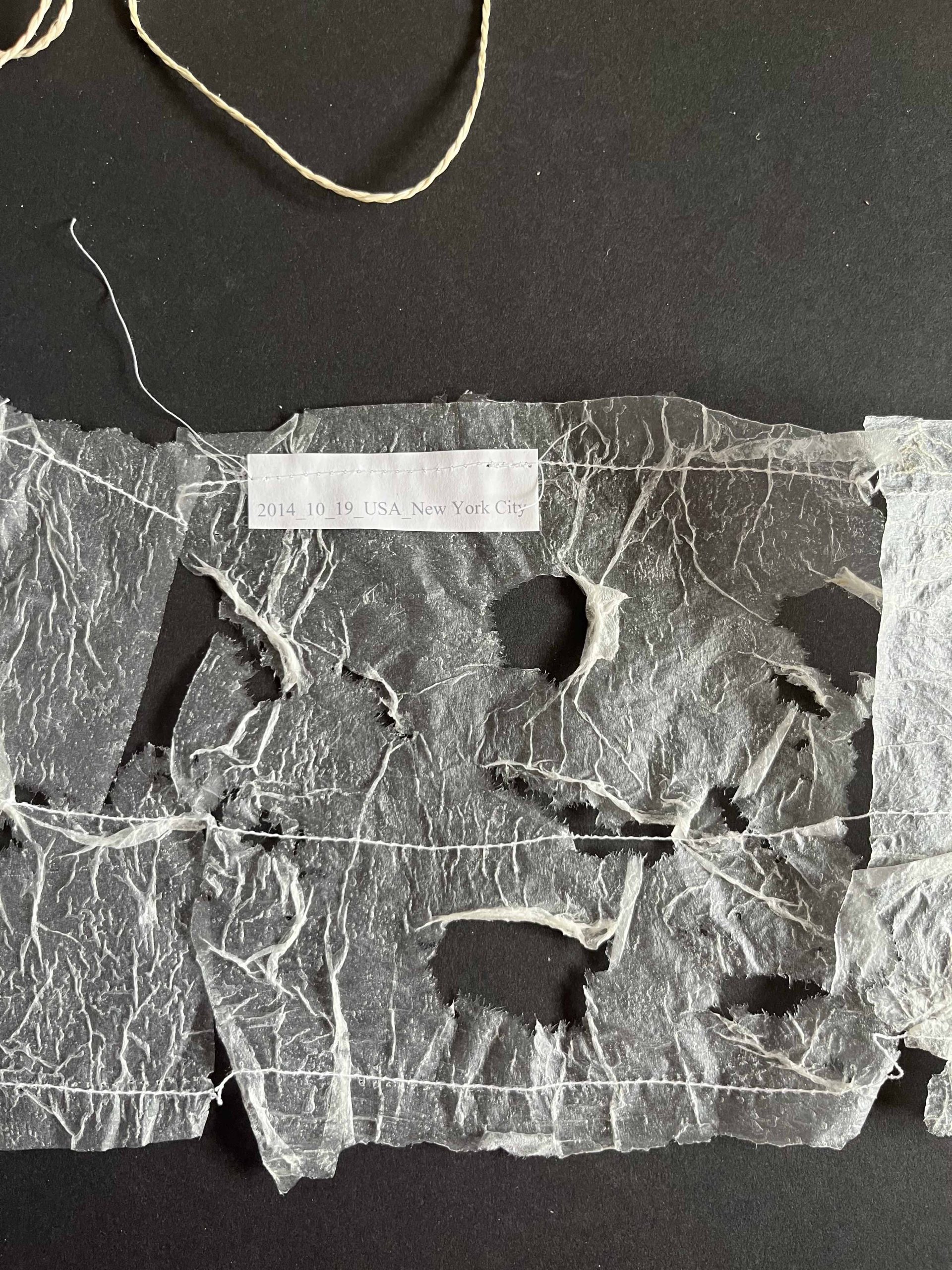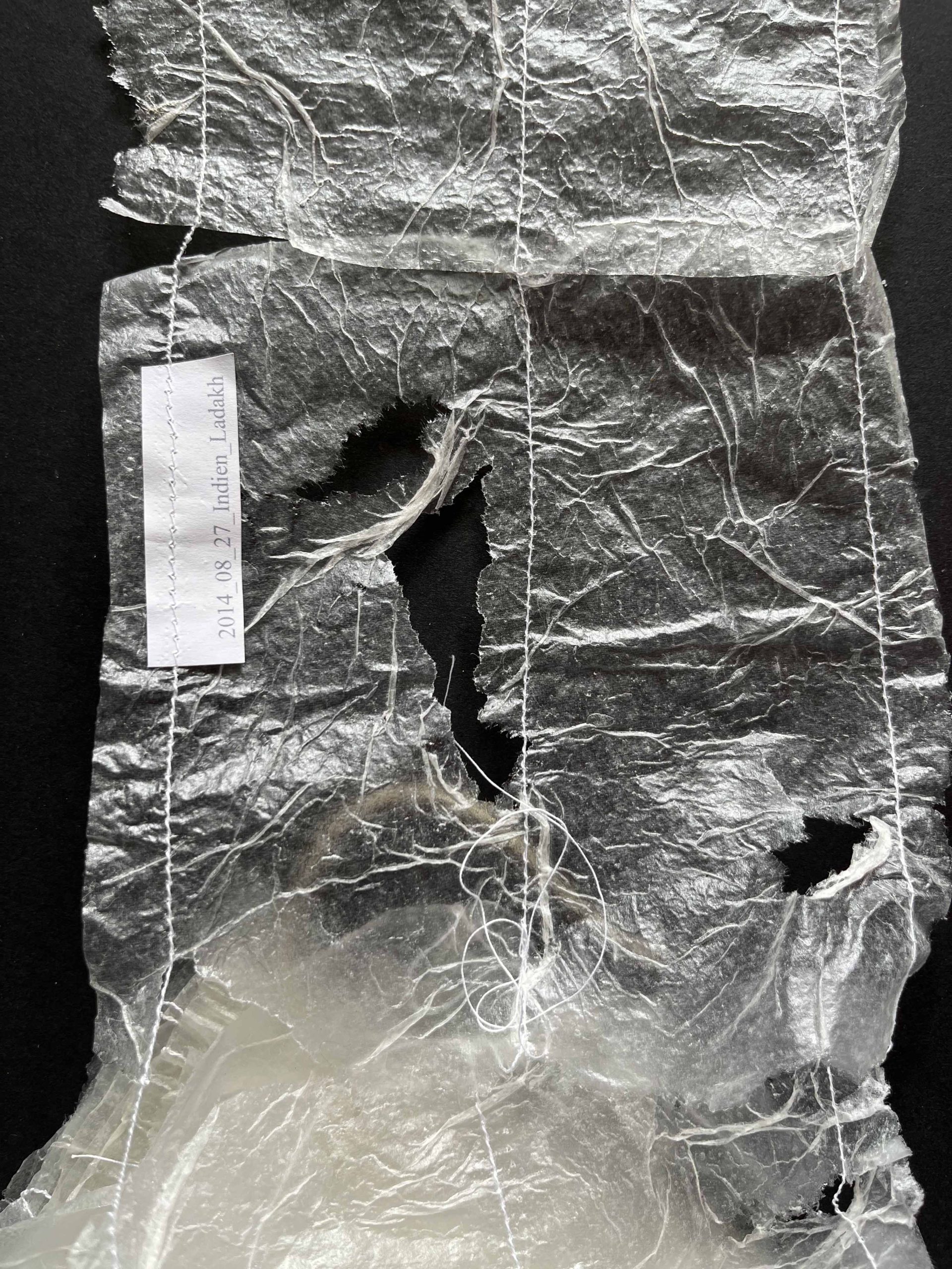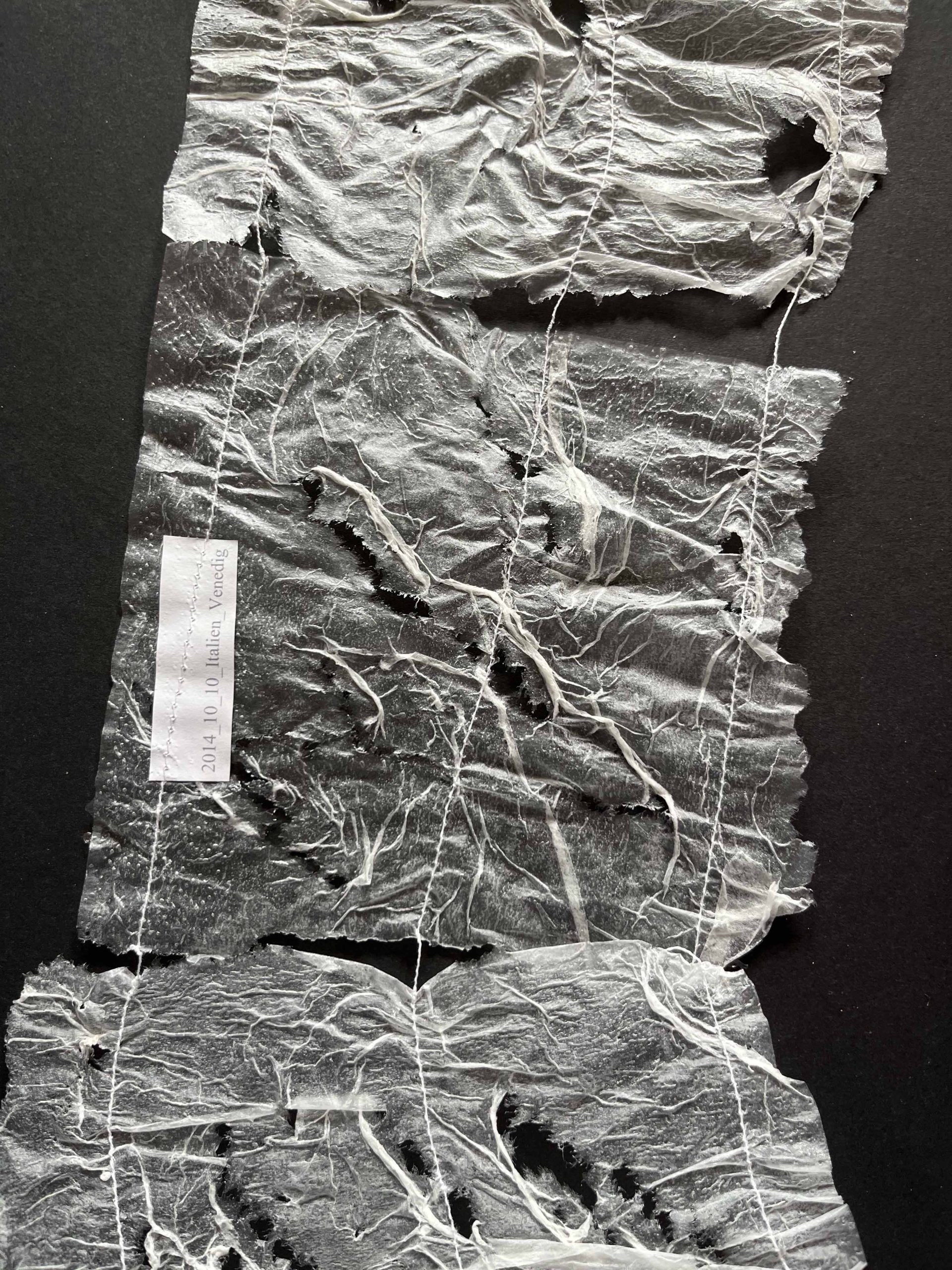 Die Papierarbeiten wurden von mir zerrissen, nach Entstehungsorten sortiert, neu zusammengesetzt und maschinell zu langen, fragilen Fahnen vernäht. Diese wurden als Wandinstallation im Rahmen einer Studio- und Themenausstellung im Museum Abtei Liesborn gezeigt. Bereits hier reagierte das Material sensibel auf Luftbewegungen und begann bei jedem Lufthauch zu schwingen.